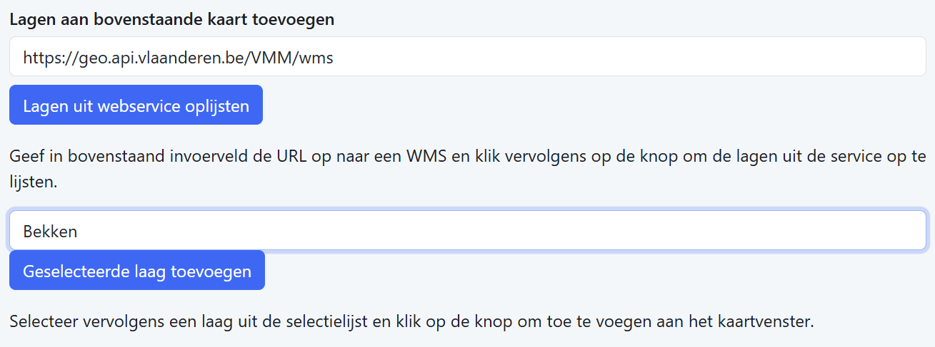 Geef de URL van een WMS op en klik op “Lagen uit webservice oplijsten”. Alle lagen uit de opgegeven webservice worden dan opgehaald en getoond in een keuzelijst. Een kaartlaag aan de webmap toevoegen door deze in de keuzelijst aan te duiden en vervolgens te klikken op "Geselecteerde laag toevoegen".