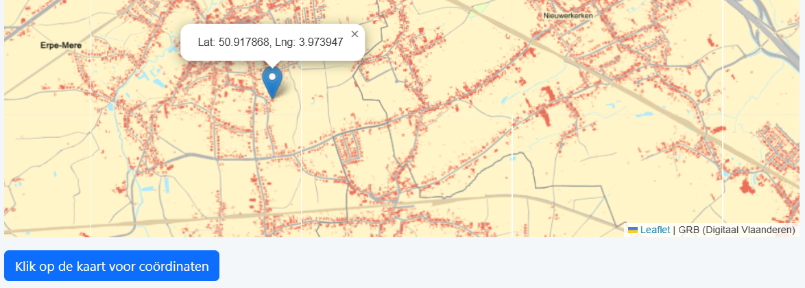 Klik op de knop “Klik op de knop voor coördinaten” en klik daarna op de kaart. De aangeklikte locatie wordt via een marker op de kaart weergegeven, alsook een tabel met EPSG:4326, EPSG:31370 en EPSG:3812 coördinaten van de aangeklikte locatie op de kaart.