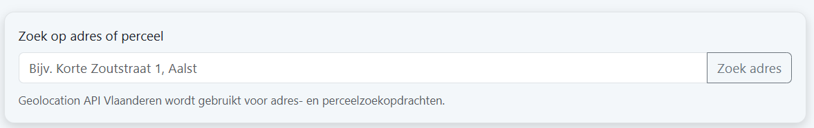 "UpperRight":"Lat_WGS84":50.938416914099165,"Lon_WGS84":4.0379867827221965,"X_Lambert72":126751.0,"Y_Lambert72":180953.92,"X_Lambert2008":626749.57,"Y_Lambert2008":680951.47}}}]}Achter de schermen zorgde ik er voor dat de zoekfunctie detecteert of het om een adres of perceel gaat (wanneer een zoekopdracht met een nummer begint en deze een '/' bevat, is het een perceelnummer is, anders een adres). Zo kon ik beide zoekopties via eenzelfde zoekknop uitwerken. Het script vraagt de coördinaten op via Geo API Vlaanderen en zoomt automatisch naar het resultaat.