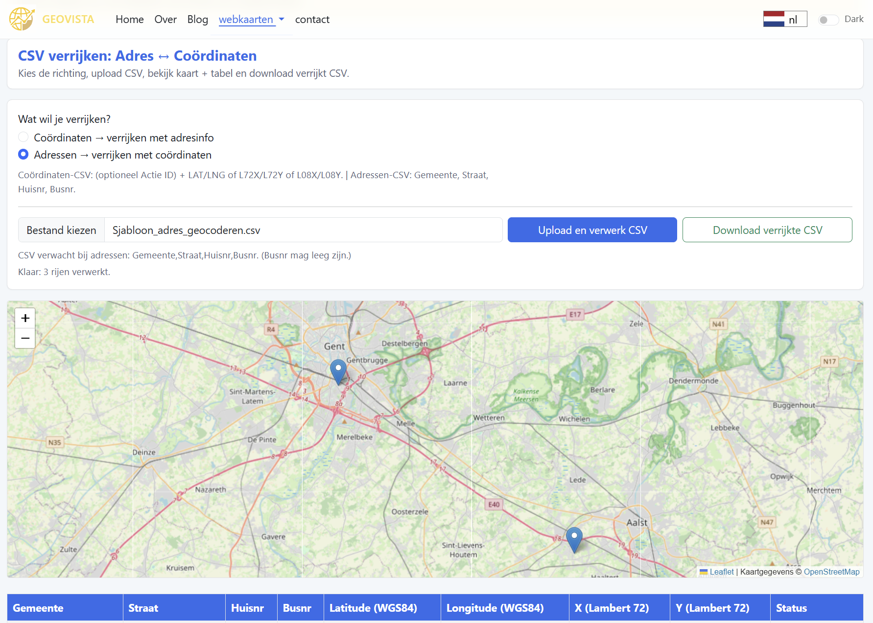 Convert addresses into coordinates in Lambert '72, Lambert 2008 and WGS84. Ideal for CSV enrichment, mapping and geo-analyses.